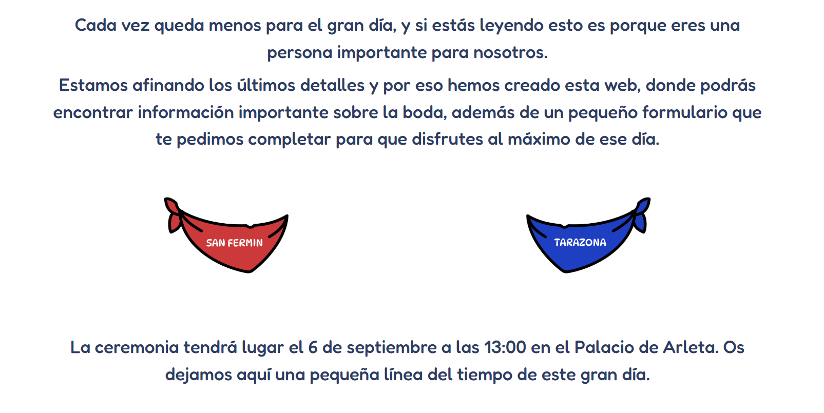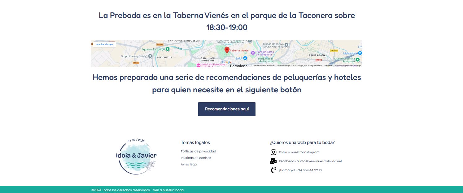 Detalles logísticos claros y visuales: lugar de la ceremonia (Palacio de Arleta), horarios, opciones de autobús y hoteles cercanos.