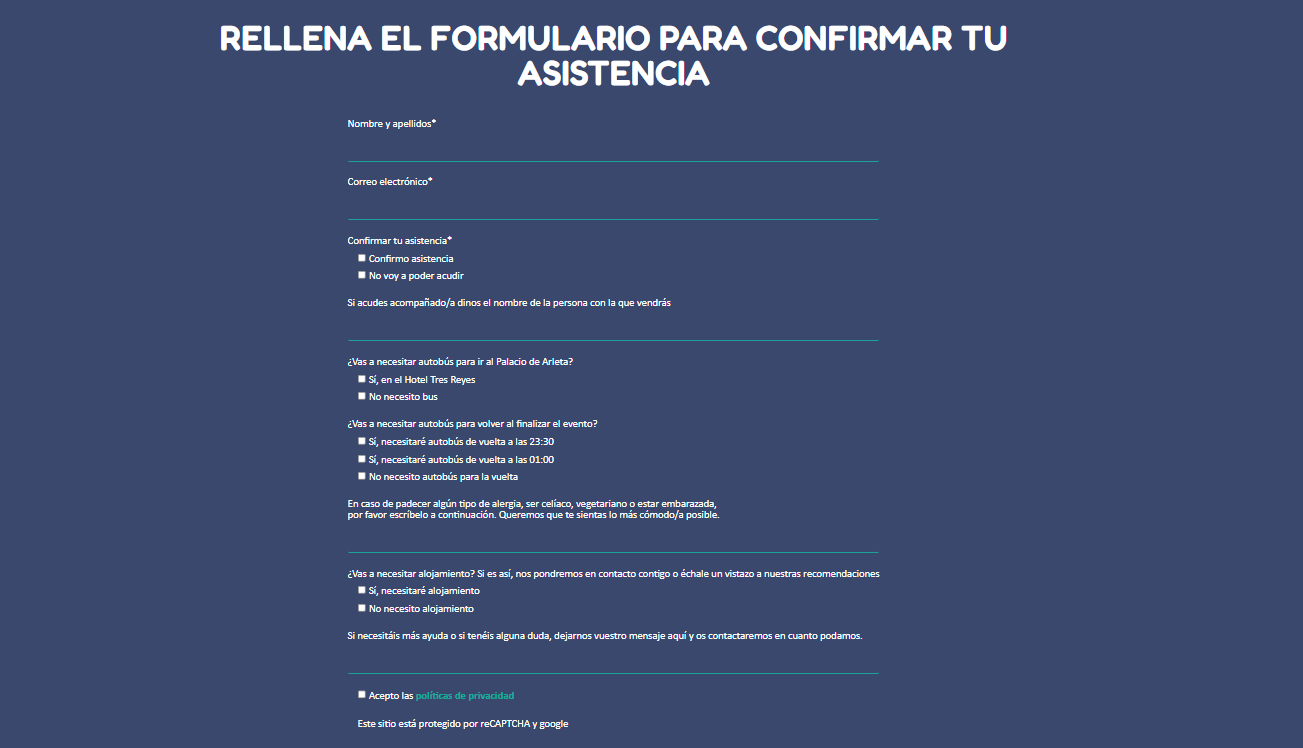 Formulario de confirmación completo con campos para acompañantes, alergias, transporte y alojamiento.
